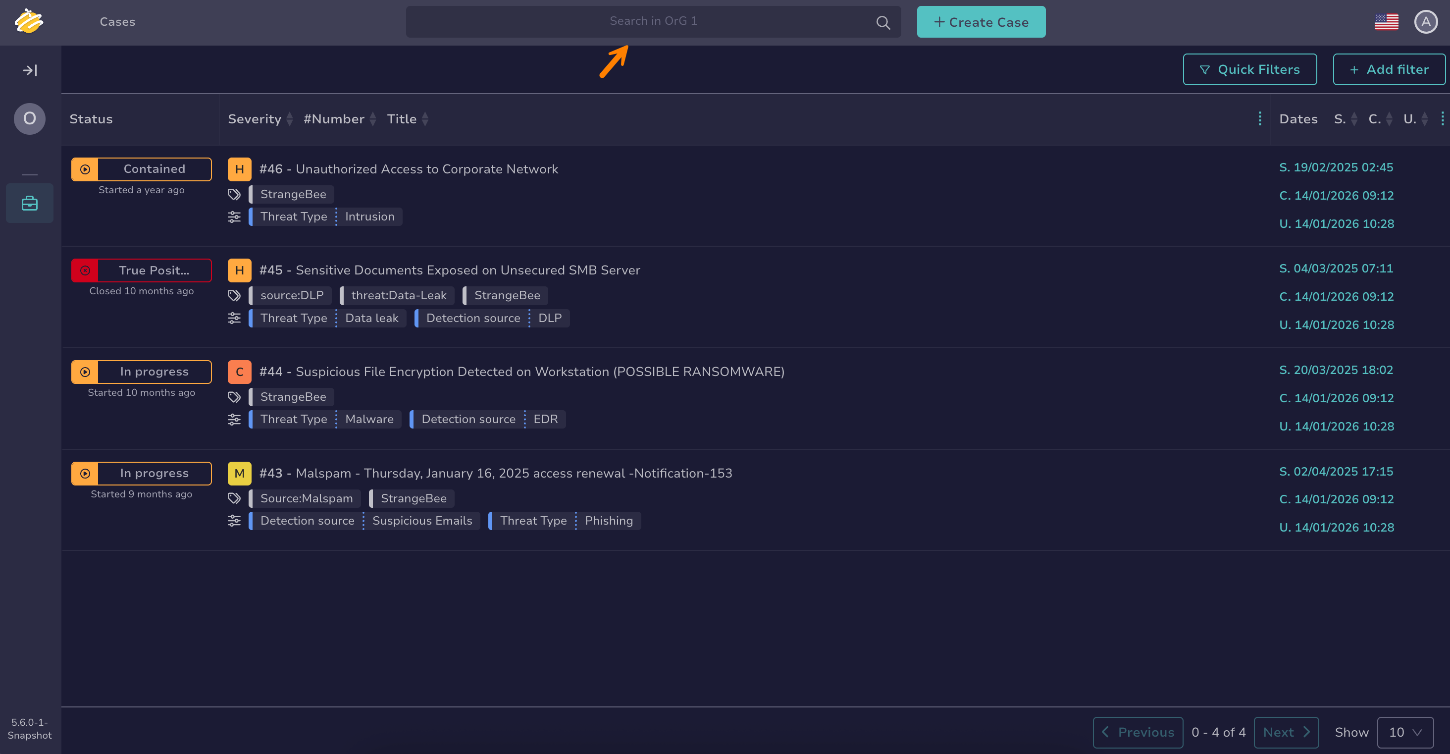 Search for cases in the TheHive Portal to find security incidents shared with you or that you've created.