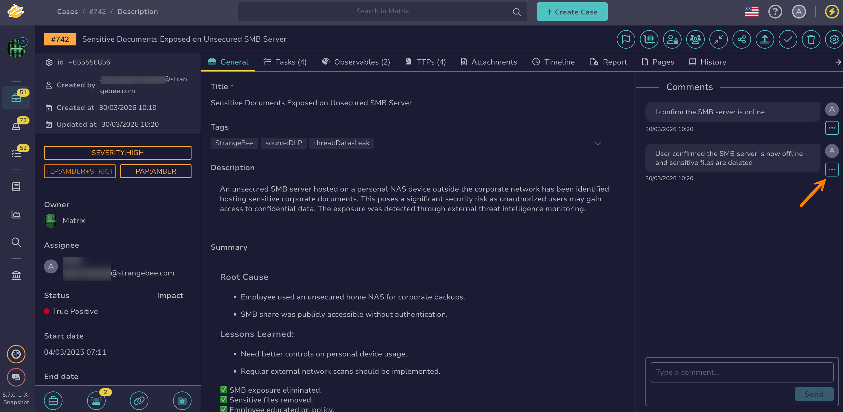 Share a comment on a case or alert with your teammates through a messaging tool or email.