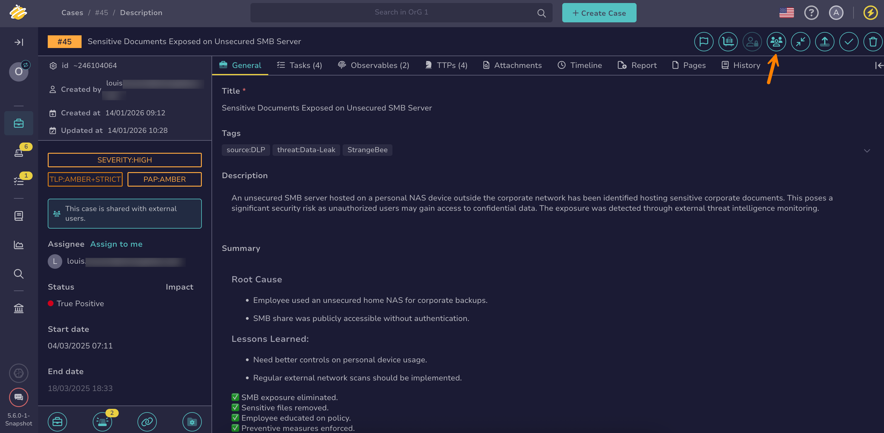 Remove external user access to cases when collaboration is complete or no longer required. Revoking access immediately prevents external users from viewing the case and interacting with it through TheHive Portal.
