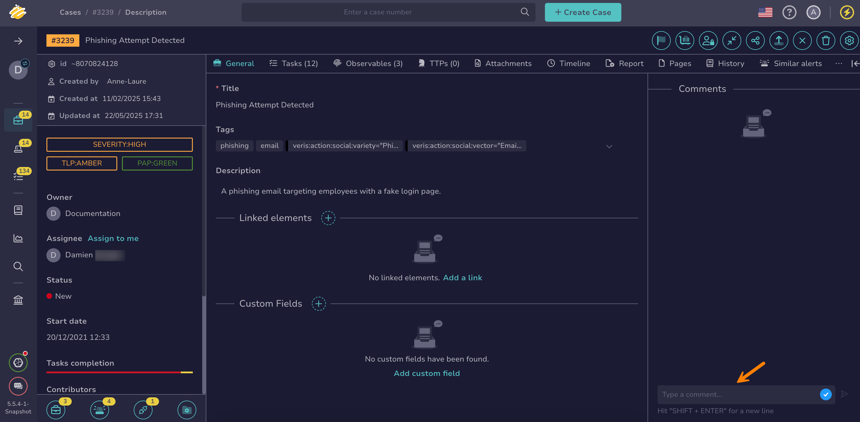 Add comments to cases to document investigation progress, share findings with team members, or provide updates to stakeholders. Comments are visible to all organizations that share the case.